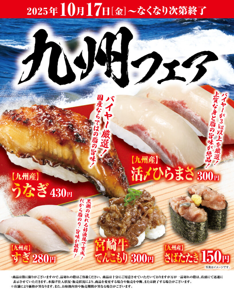 2025.10.17 ショップ情報 【10月17日(金)〜なくなり次第終了】「九州フェア」開催中! 厳選商品を取りそろえた「九州フェア」。 この機会にぜひお越しください! お問い合わせ くら寿司 045-642-8608