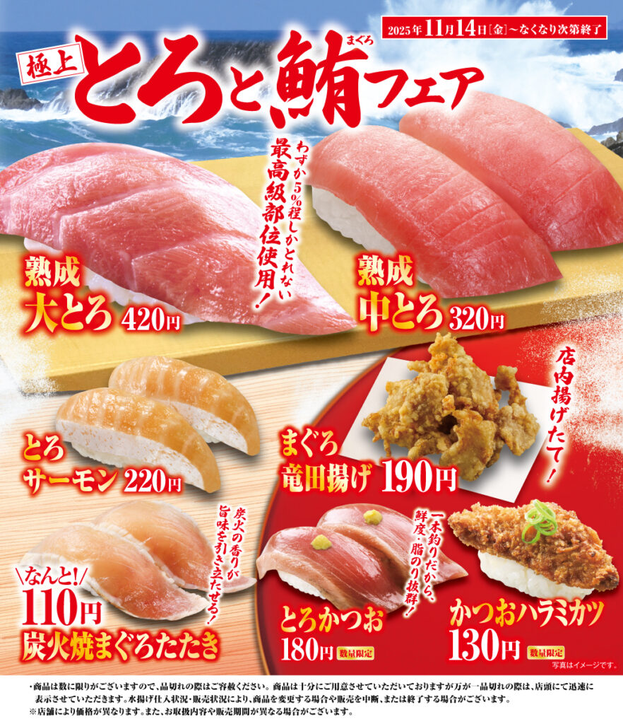 2025.11.14 ショップ情報 【11月14日(金)〜なくなり次第終了】 「極上とろとまぐろフェア」開催中! 厳選商品を取りそろえた「極上とろとまぐろフェア」。 この機会にぜひお越しください! お問い合わせ くら寿司 045-642-8608