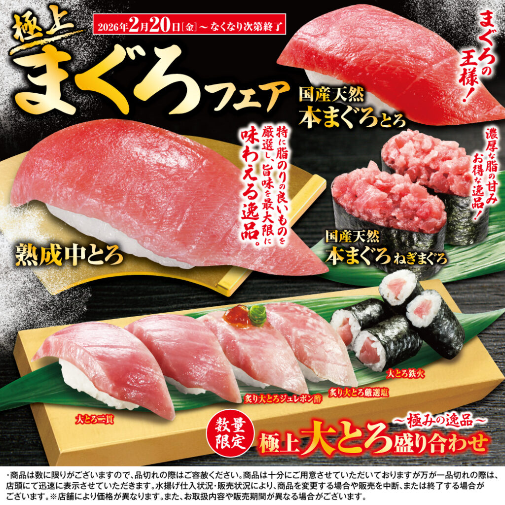 2026.02.20 ショップ情報 【2月20日(金)〜なくなり次第終了】「極上まぐろフェア」開催中! 厳選商品を取りそろえた「極上まぐろフェア」。 この機会にぜひお越しください! お問い合わせ くら寿司 045-642-8608