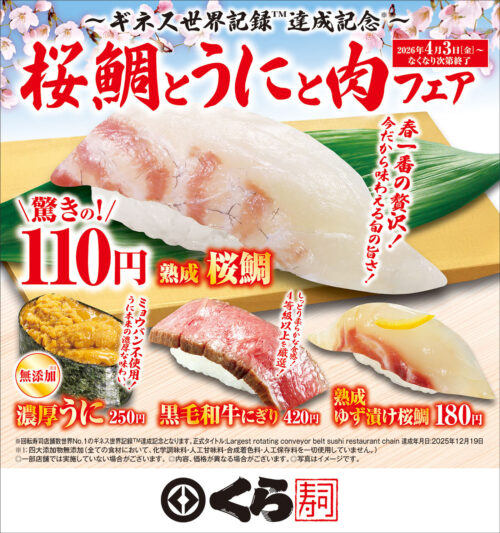 2026.04.03 ショップ情報 【4月3日(金)~なくなり次第終了】「桜鯛とうにと肉フェア」開催中! 厳選商品を取りそろえた「桜鯛とうにと肉フェア」。 この機会にぜひお越しください! お問い合わせ くら寿司 045-642-8608